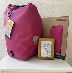 ...passend zum ersten Women's Social Ride ist die Ortlieb Backroller in "cyber pink". Ist das nicht eine wunderbare Farbe? Die Tasche ist in bewährter Ortlieb-Qualität und mit Haken ausgestattet, die sich an quasi jeden Gepäckträger anpassen lassen. Dank des Rollverschlusses und des wasserdichten Materials sind Ihre Utensilien zuverlässig geschützt. Das Volumen beträgt 20 Liter, das sollte für eine ausgiebige Tagestour also locker reichen! Die Tasche kostet 90,-€ und ist bei uns auf Lager. | ![]() | | |